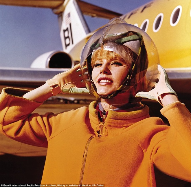 Một nữ tiếp viên của hãng Braniff Airways đội chiếc mũ bảo hiểm lấy cảm hứng từ nhà du hành vũ trụ. Đây là thiết kế của Emilio Pucci năm 1965.