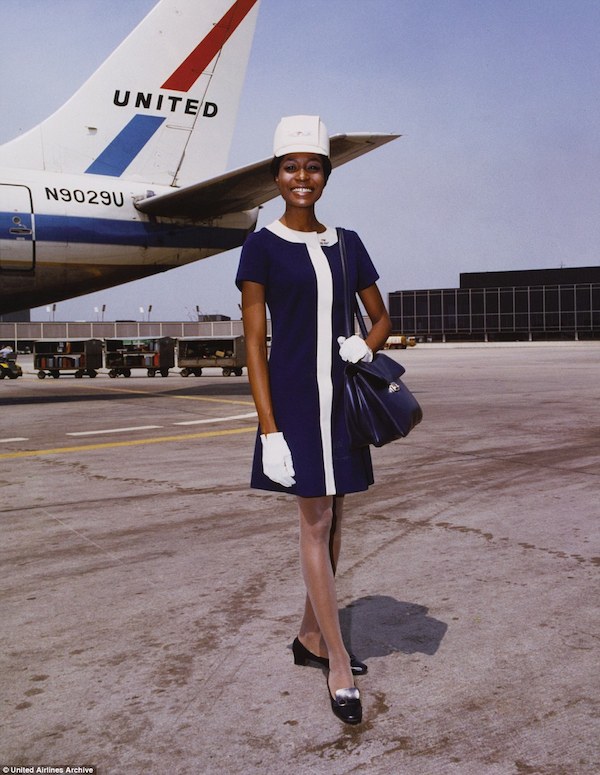 Theo thời gian, đồng phục các nữ tiếp viên dần thay đổi, hướng đến sự thanh lịch và thuận tiện hơn với mẫu váy chữ A. Đây là trang phục của nữ tiếp viên United Airlines, do nhà thiết kế Jean Louis tạo ra năm 1968