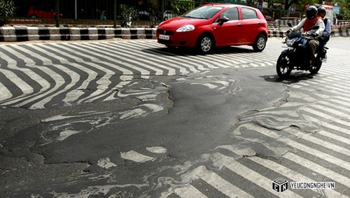 Hiện tượng nhựa đường nóng chảy được ghi nhận rõ nhất ở những khu vực kẻ vạch sơn. Sự thay đổi tình trạng bề mặt đường khiến các vạch sơn thẳng hàng trở nên biến dạng. |