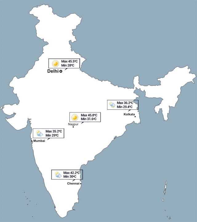 Nhiệt độ tại một số địa điểm ở Ấn Độ ngày 26/5. Thủ đô chịu mức nhiệt 45,5 độ C.