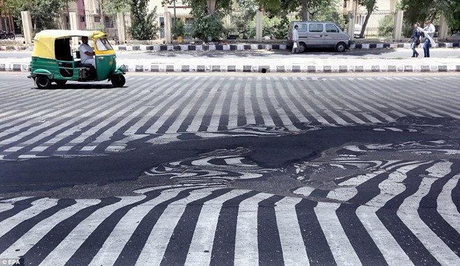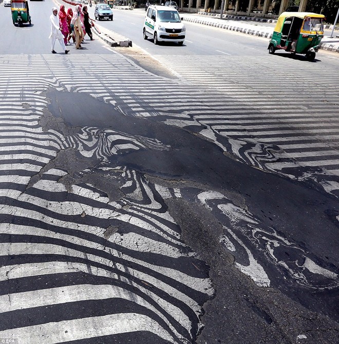 Nhựa tại một đoạn đường ở thủ đô Delhi của Ấn Độ tan chảy khi thời tiết ở quốc gia Nam Á lên tới gần 50 độ C.