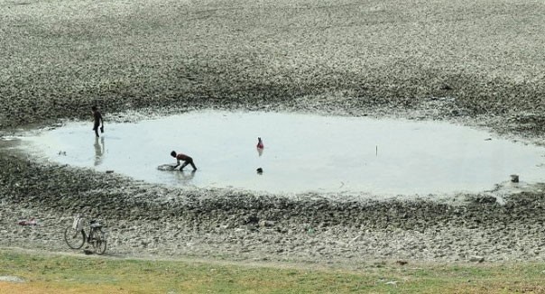 | Người dân bắt cá trong ao sắp cạn ở thị trấn Phaphamau, thành phố Allahabad, bang Uttar Pradesh. |