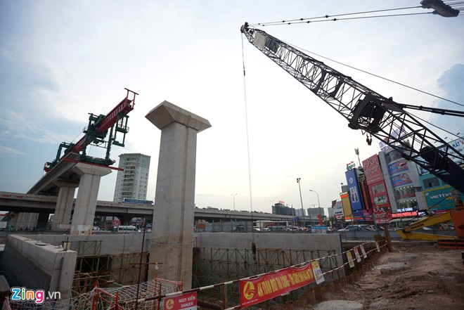 Dọc trục đường Nguyễn Trãi, dự án đường sắt trên cao Cát Linh - Hà Đông đang trong giai đoạn lắp đặt dầm vượt qua nút giao Khuất Duy Tiến.