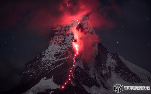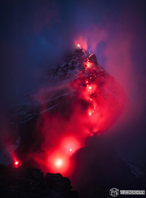 Một nhóm các nhà leo núi đã leo lên sườn núi Hörnli của Matterhorn và thắp sáng ánh đèn màu đỏ tươi vào lúc bình minh, chiếu sáng con đường mà Whymper đã cùng đi với đội của ông trong chuyến chinh phục thành công đầu tiên.