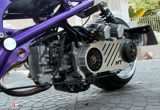 Động cơ nguyên bản trên Zoomer được giữ lại, nhưng tháo phần lốc, để lộ những vòng tua máy khi xe hoạt động.