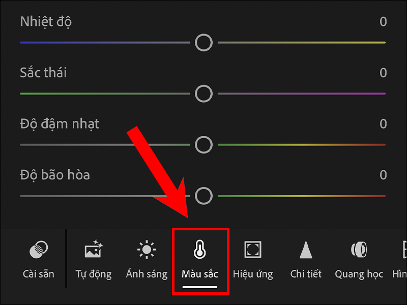 Các tone màu nằm cạnh mục Ánh sáng và chứa các mục nhỏ bao gồm: Nhiệt độ, sắc thái, độ đậm nhạt, độ bão hoà,…