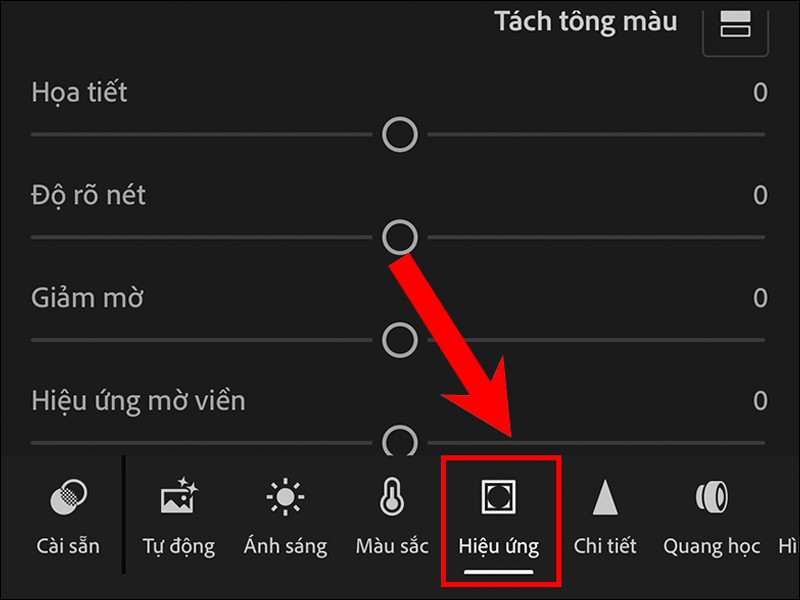 Phần Hiệu ứng của Lightroom gồm các phần như: Hoạ tiết, độ rõ nét, nhiễu hạt, hiệu ứng mờ viền,...