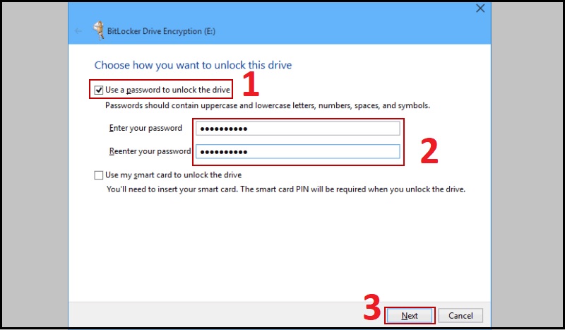 Bước 2: Bạn hãy nhấn chọn Use a password to unlock the drive > Nhập mật khẩu bạn muốn thiết lập vào ô Enter your password và Reenter your password > Nhấn chọn Next.