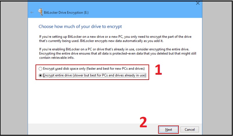 Encrypt entire drive (slower but best for PCs and drives already in use): thực hiện mã hóa dữ liệu toàn bộ ổ đĩa.