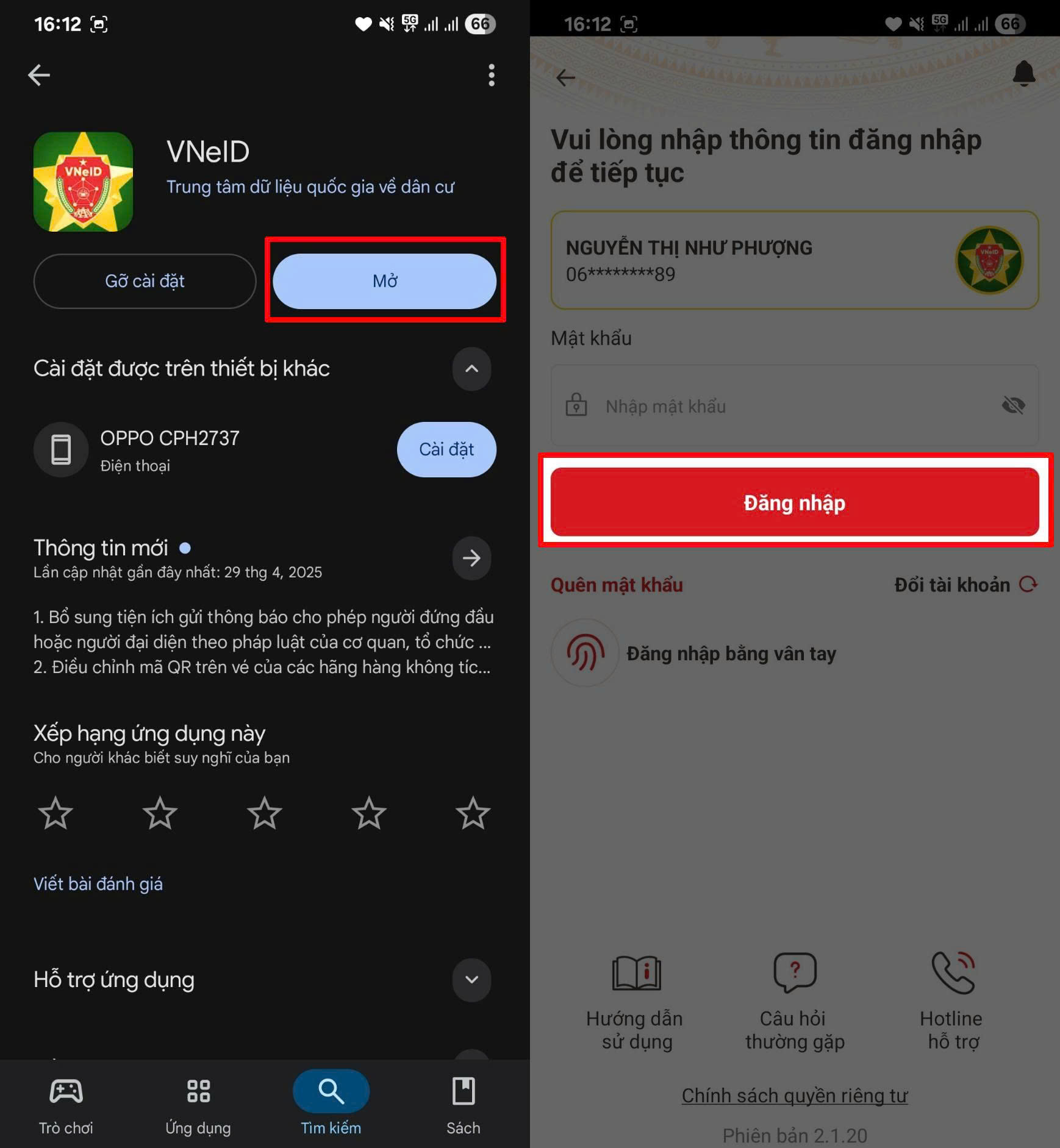 Bước 1: Mở ứng dụng VNeID lên > Đăng nhập vào tài khoản định danh điện tử của bạn để truy cập các thông tin cá nhân đã được xác thực.