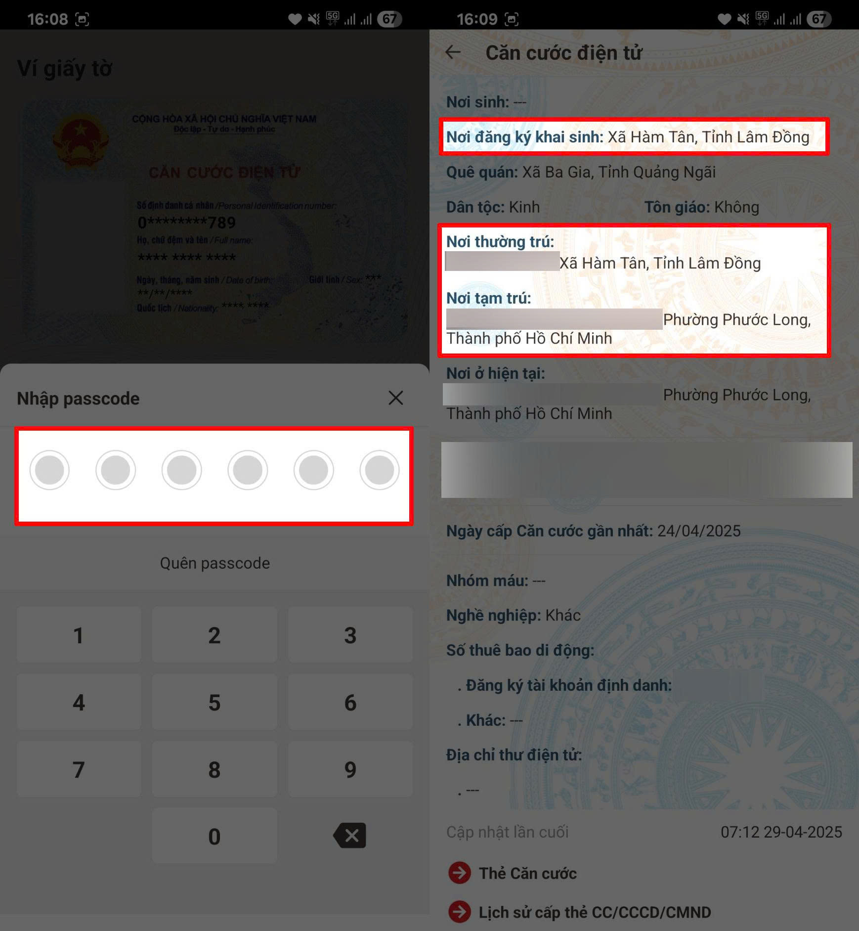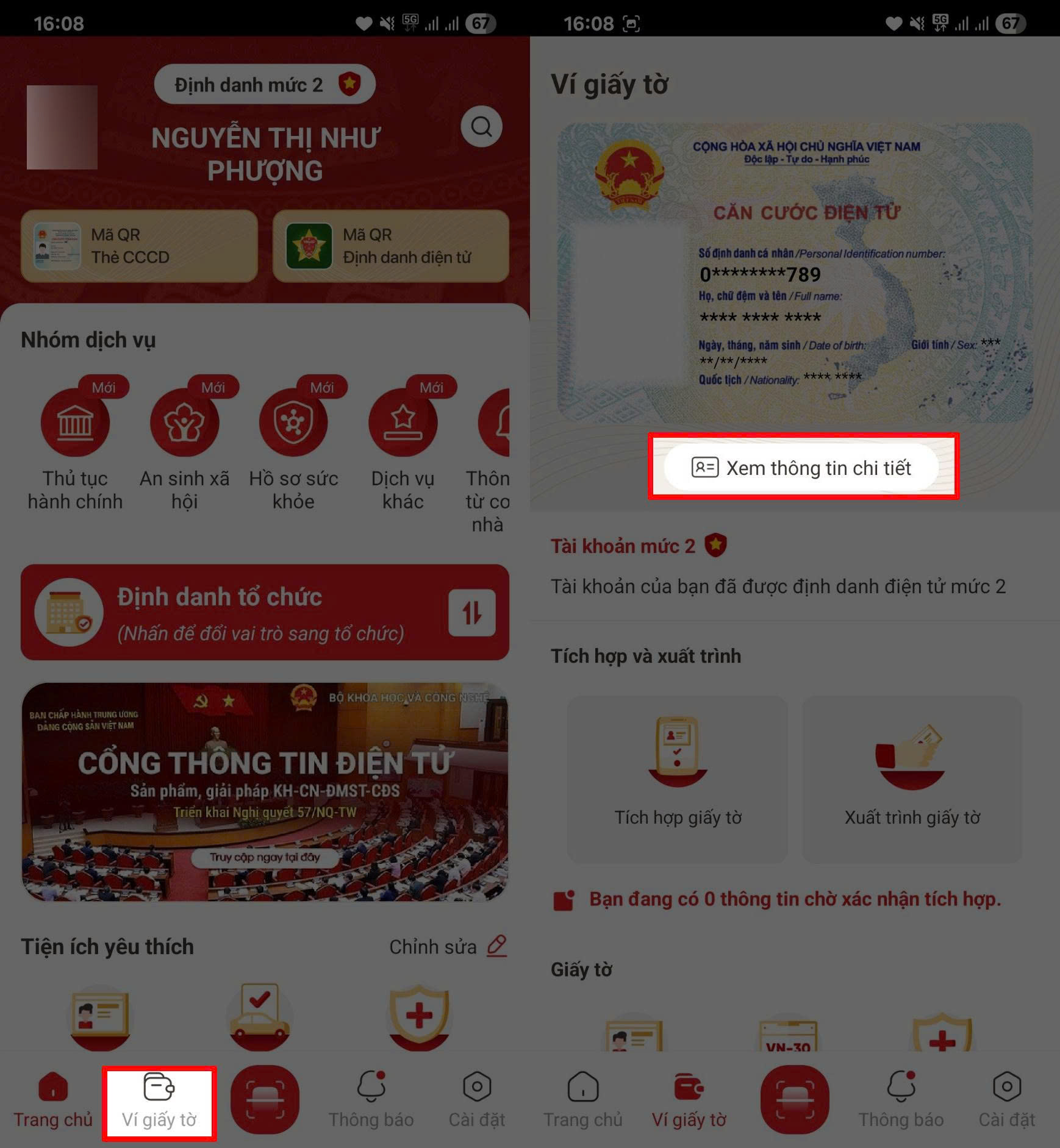 Bước 2: Nhấn chọn vào mục Ví giấy tờ > Chọn tiếp đến mục Thẻ Căn cước điện tử > Sau đó nhấn vào mục Xem thông tin chi tiết để truy cập đầy đủ dữ liệu liên quan đến CCCD.