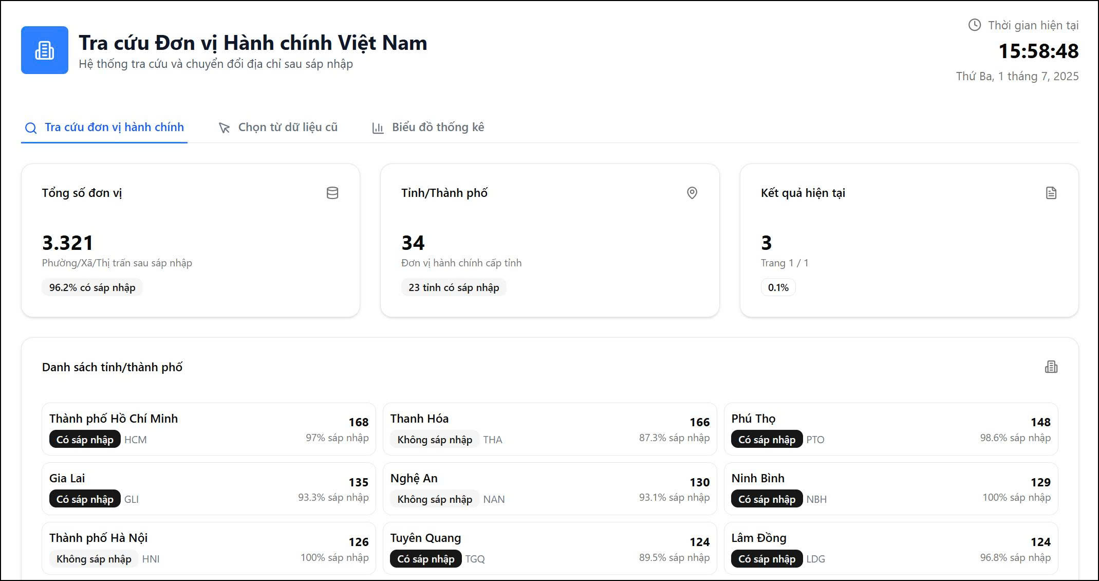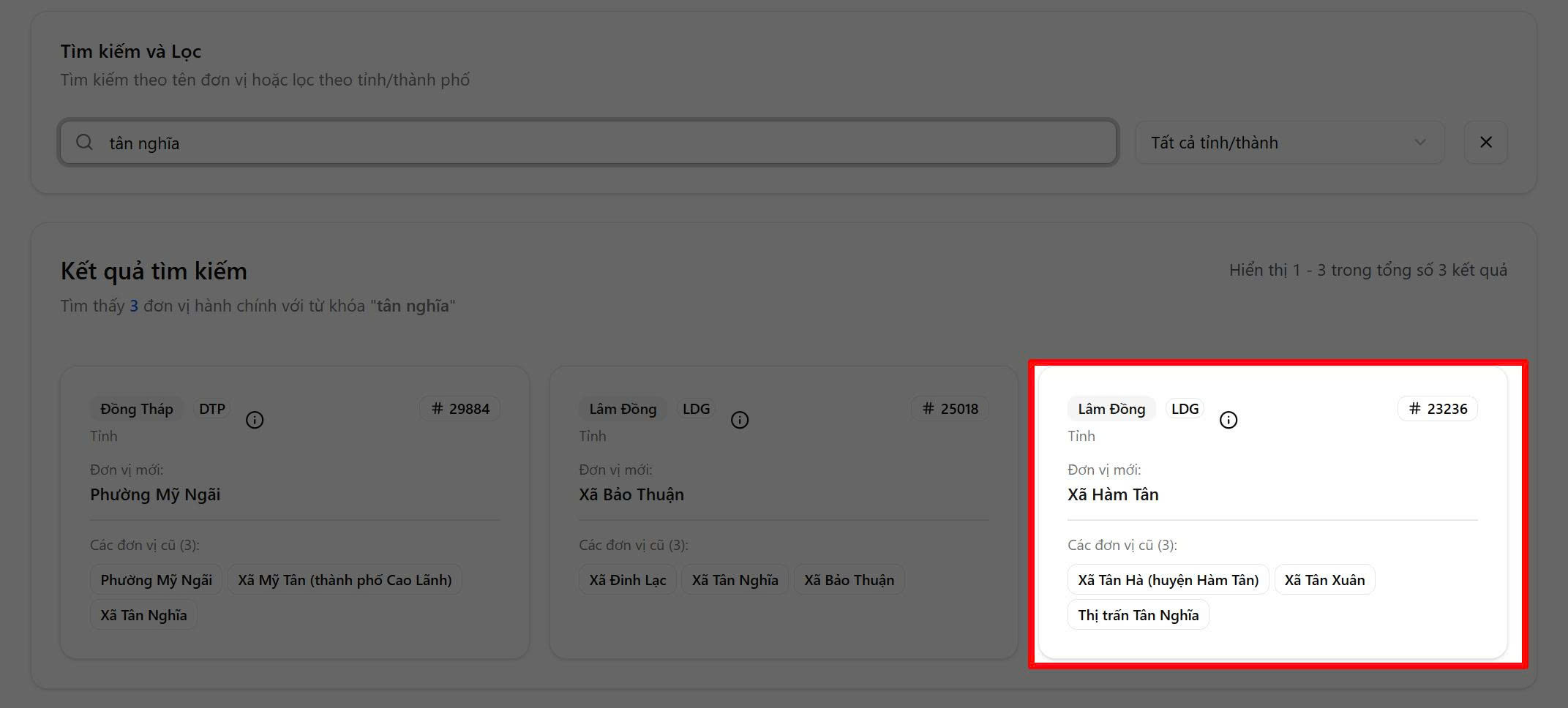 Bước 3: Hệ thống sẽ hiển thị kết quả mới tương ứng với địa chỉ sau khi sáp nhập, giúp bạn biết chính xác tên đơn vị hành chính hiện tại là gì và đã được cập nhật ra sao.