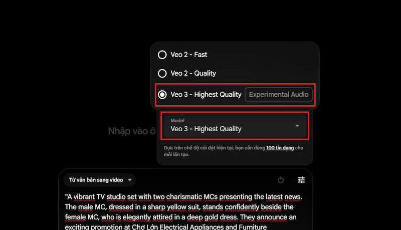 Khi gặp lỗi video Veo 3 không có tiếng, bạn cần kiểm tra lại xem đã chọn đúng model tạo video hay chưa. Để video Veo 3 có tiếng, bạn cần đảm bảo chọn đúng model là Highest Quality (Experimental Audio) Veo 3.