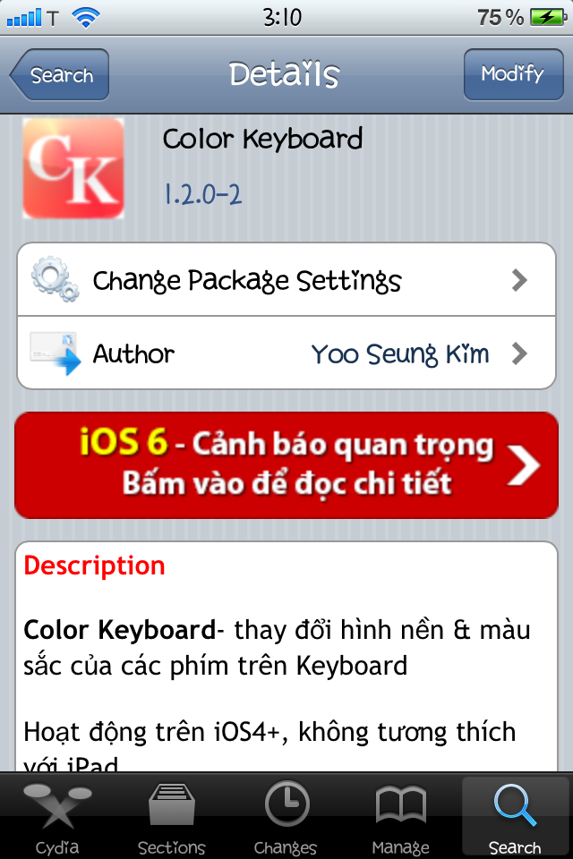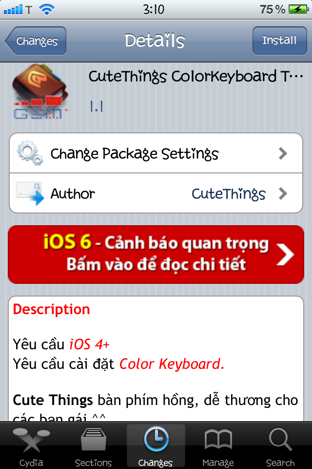 1. Bàn phím sử dụng phần mềm Color Keyboard yêu cầu iPhone chạy iOS 4+ (nghĩa là có thể dùng cho iPhone 3G, 3GS, 4, 4S, iTouch 3, 4 đang chạy iOS 4.0 trở lên)