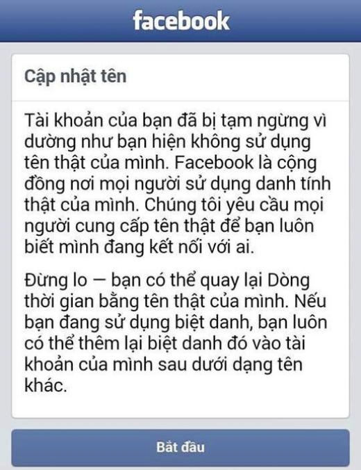 Trong những ngày gần đây, nhiều người dùng mạng xã hội Facebook tại Việt Nam đã bày tỏ sự bức xúc vì bị quản trị viên website này đóng tài khoản với lí do nghi ngờ không dùng tên thật.