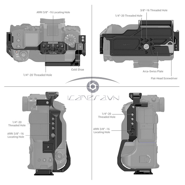 Máy ảnh được gắn vào lồng bằng vít 1/4 "-20 và hai khóa bên để giữ máy ảnh của bạn cố định một cách chắc chắn. Chân đế kiểu Arca tích hợp cho phép gắn trên gimbal hoặc đầu ba chân tương thích Arca mà không cần tấm máy ảnh. Hai giá gắn hotshoe tích hợp cung cấp các điểm gắn thuận tiện để khớp nối cánh tay, màn hình ngoài và các phụ kiện khác.