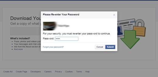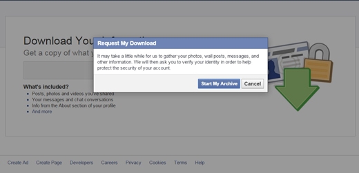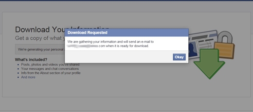 Bước 5: Một cửa sổ nhỏ với nội dung "Yêu cầu tải xuống" sẽ hiện ra cùng thông báo “Sẽ mất một lúc để chúng tôi tập hợp hình ảnh, bài đăng, tin nhắn và những thông tin khác của bạn. Sau đó, bạn sẽ được thông báo để xác nhận nhằm giúp bảo vệ an toàn cho tài khoản của bạn.” (It may take a little while for us to gather your photos, wall posts, messages and other information).