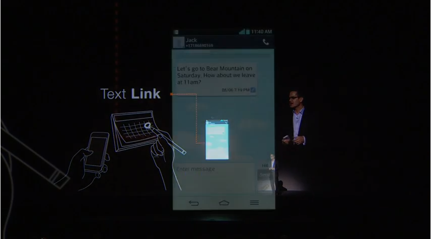 Phím bấm trung tâm không đơn giản là phím mở màn hình, mà tuỳ thuộc vào từng hoàn cảnh khác nhau mà nó có chức năng khác nhau. Mặc định thì nó có chức năng Quickmemo, tất nhiên bạn có thể dễ dàng thay đổi trong phần cài đặt của máy. Rất nhiều các thao tác mới được LG trang bị cho G2 như: nhấp đúp vào màn hình để mở máy, đưa điện thoại lên tai và nói Answer Me để trả lời cuộc gọi...