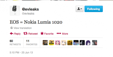 Liên quan đến smartphone Windows Phone 8 sở hữu camera khủng Lumia EOS, tài khoản @evleaks, chuyên cung cấp thông tin rò rỉ về các thiết bị công nghệ đã chia sẻ trên Twitter về tên gọi chính thức của chiếc điện thoại này. Theo đó, Lumia EOS nhiều khả năng sẽ có tên gọi chính thức là Lumia 1020.