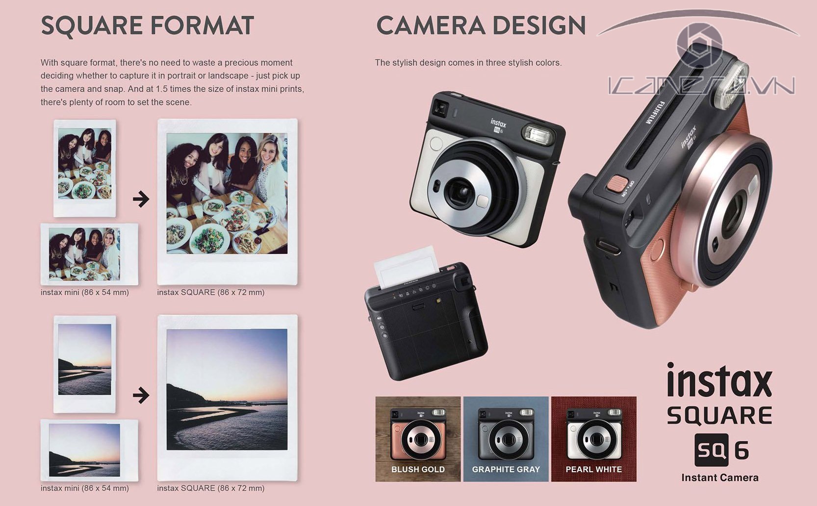 Instax Square SQ6 cho bạn 3 lựa chọn về màu sắc đều rất thời trang, là: Blush gold, Graphite gray, Pearl white