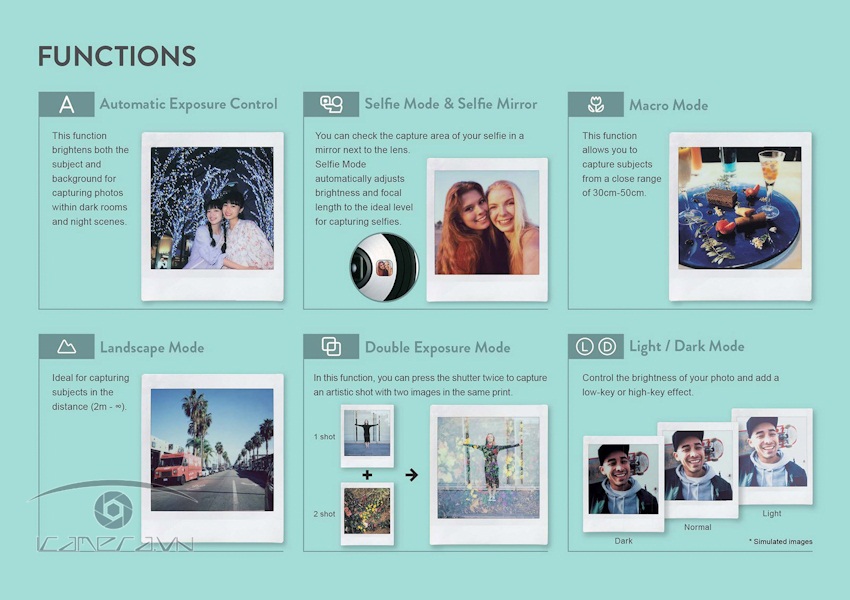 Chiếc máy ảnh cũng có 3 bộ lọc màu sắc là cam, tím và xanh lá. Nếu sử dụng cùng với đèn flash của máy có thể cho ra các hiệu ứng màu sắc khác nhau nữa.