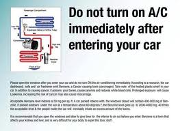 Here’s why: According to research, the car’s dashboard, seats, a/c ducts, in fact ALL of the plastic objects in your vehicle, emit Benzene, a Cancer causing toxin. A BIG CARCINOGEN. Take the time to observe the smell of heated plastic in your car when you open it, and BEFORE you start it up.