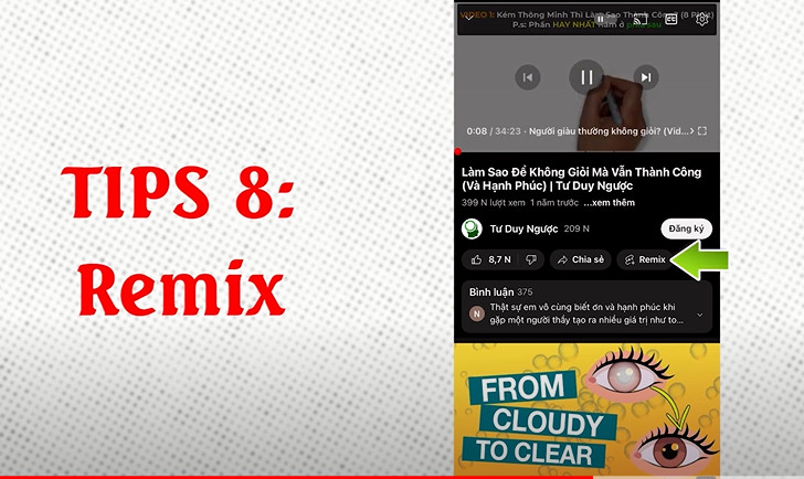 Ngay ở dưới video các bạn sẽ nhìn thấy một cái chữ tên là Remix. Trong phần này sẽ có âm thanh cắt và phông xanh các bạn sẽ sử dụng âm thanh một đoạn của cái video gốc video mà mình muốn cắt cái âm thanh đó ra thì mình chọn và thường thì cái đoạn này thì chỉ được lấy 15 giây để tạo thành những cái video ngắn, các bạn có thể kéo để điều chỉnh là đoạn video đoạn audio nào mà mình muốn lấy âm thanh sau đó thì mình ghép cùng với cả hình ảnh của mình. Teên này có rất là nhiều cái phần chức năng thay đổi về màu sắc. hình ảnh, thêm text để các bạn có thể tùy biến tạo thành một cái video riêng của mình. Cái phần này các bạn có thể liên tưởng đến Tik Tok khi mà mình kết hợp với ai thì nó gọi là remix, khi làm xong video này các bạn cũng có thể đăng trực tiếp trên kênh của mình hoặc là lưu bản nháp.