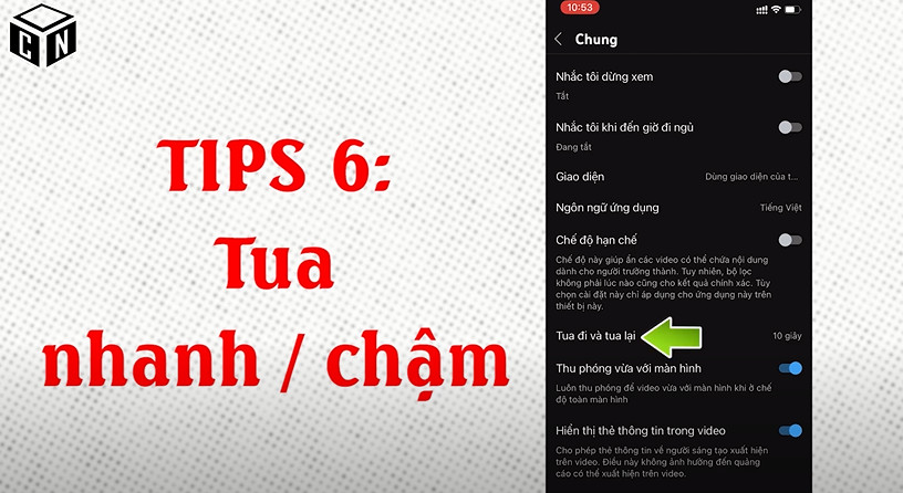 Các bạn sẽ ấn vào Logo bên phải phía trên ấn vào phần Chung các bạn sẽ thấy chữ tour đi và tua lại 10 giây 5 giây hay là nhai nhiều hơn thì có thể là 15 20 30 hoặc 60 .Mỗi lần mà các bạn ấn tua đi ấn hai lần ở trên cái clip YouTube tua đi hoặc là quay lại thì cái bước của cái việc điều chỉnh này nó sẽ theo ý bạn muốn.