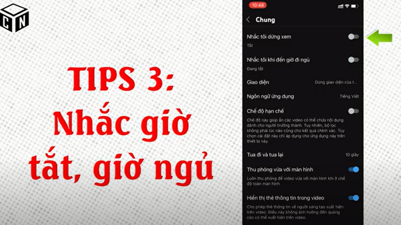 Sẽ hiện ra phần là Nhắc tôi dừng xem và nhắc tôi khi đến giờ ngủ .Đây là một cái tip khá hữu ích với những bạn mà gọi là nghiện YouTube quá và chúng ta cần YouTube nhắc nhở khi cần phải nghỉ ngơi