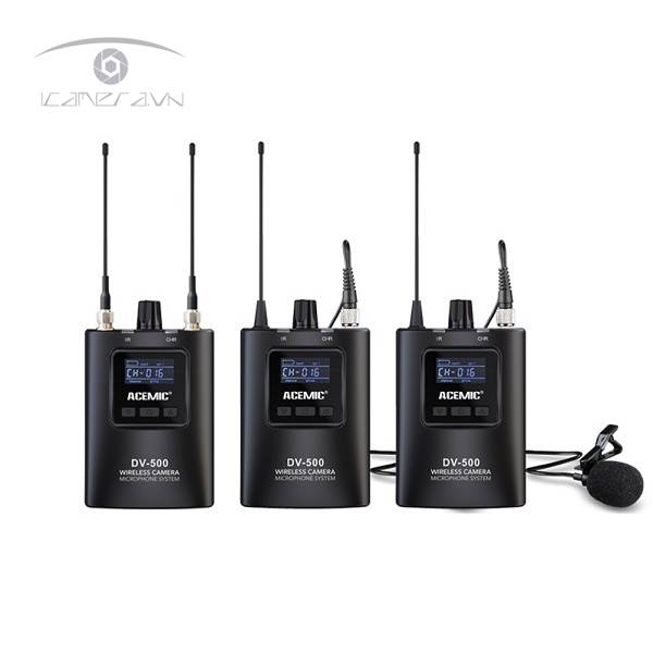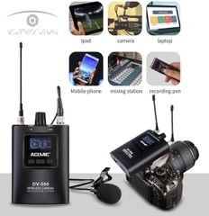 Bộ mic thu âm ACEMIC–DV-500 Dual dòng micro không dây cài áo wireless của hãng ACEMIC hỗ trợ chuyên nghiệp trong việc quay phim. ACEMIC–DV-500 Dual có thiết kế nhỏ gọn, âm thanh chân thực và cho phép sử dụng như mic cài áo trên hai người khác nhau, đồng thời chỉ cần người dùng gắn bộ thu cực kỳ nhỏ gọn lên máy ảnh.