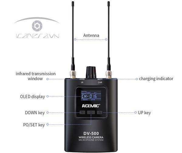 ACEMIC–DV-500 Dual sử dụng sóng ăng ten đôi giúp truyền sóng trong khoảng 80 mét không vật cản. Nó có tính năng đồng bộ hóa IR tải xuống tần số, ngoài một Jack đầu cắm 3 pin XLR tiêu chuẩn được tích hợp phía sau bộ thu phát ACEMIC–DV-500 Dual