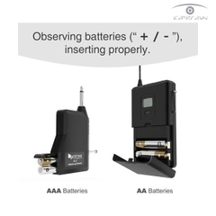 Bộ nhận được cấp nguồn từ một cặp pin cỡ AAA trong khi bộ phát được cấp nguồn bằng pin AA. Màn hình LCD dễ đọc của máy phát hiển thị thời lượng pin và kênh tần số hiện tại.