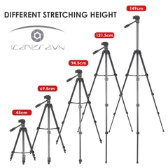 - 17.7inch đến 58.6inch với 4 phần điều chỉnh hợp kim nhôm chân và cột trung tâm, hoàn toàn mở rộng lên đến 58.6inch (149cm), chiều cao tối thiểu 17.7inch (45cm).