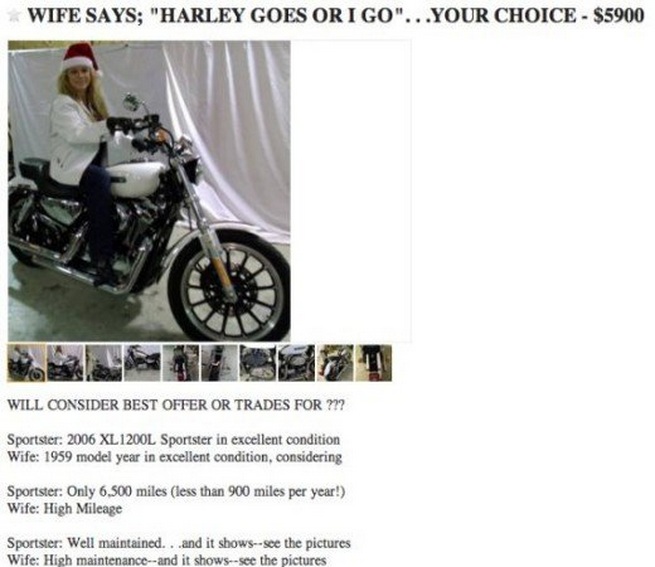 Mẩu quảng cáo của Bob White trên trang Craigslist, khu vực bang Virginia, Mỹ có tiêu đề rất kì cục: ‘Wife says: “Harley goes or I go”… Your choice.’(Vợ tôi nói: “Nó (Harley-Davidson Sportster) hay là em sẽ ra khỏi cái nhà này” … Tùy bạn chọn.)