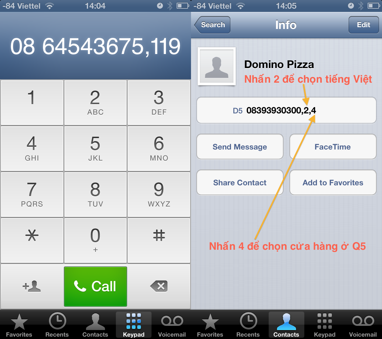 Chắc ít bạn biết là chúng ta có thể tự động hóa việc nhấn các số lựa chọn này, ví dụ khi gọi tới tổng đài của quán pizza, bạn nghe ng ta nói gì đó, sau đó phải nhấn số 2 để lựa tiếng Việt, sau đó nhấn tiếp phím số 4 để được gặp em tiếp viên, để tự động hóa, các bạn chỉ cần nhấn số điện thoại của quán, sau đó nhấn giữ nút *, nó sẽ biến thành dấu phẩy (,) sau đó bạn thêm tiếp các lựa chọn
