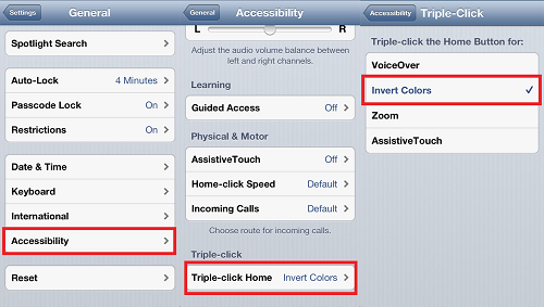 Nhấn 3 lần nút home để kích hoạt đảo màu