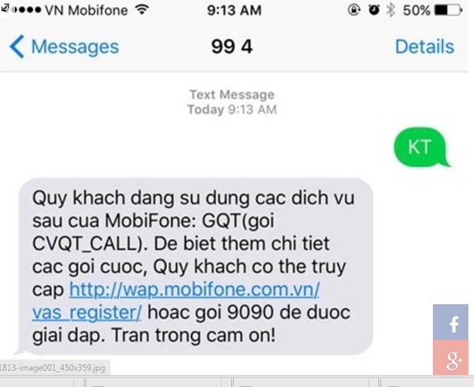 Mobiphone: soạn tin nhắn cú pháp KT gửi 994