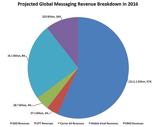 Trong số này, SMS vẫn dẫn đầu khi chiếm 57%, tương đương 111 tỷ USD bên cạnh các dịch vụ quen thuộc khác. Tuy nhiên, một loại hình khác đang chen chân vào thị trường này là OTT - dịch vụ gửi thông điệp miễn phí qua Internet (Wi-Fi, 3G/4G) mà không phụ thuộc vào các hãng viễn thông.