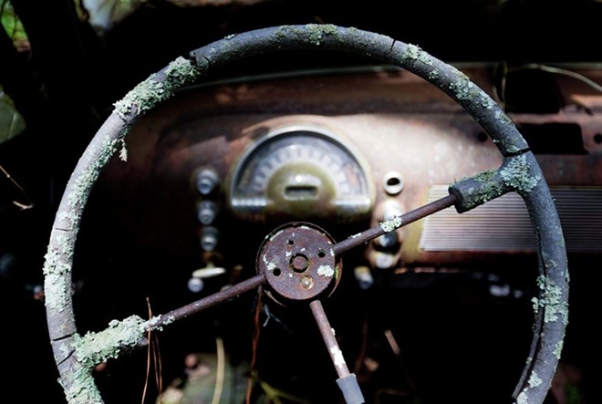 | Tay lái hoen gỉ của chiếc xe bỏ hoang. |