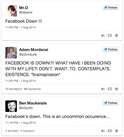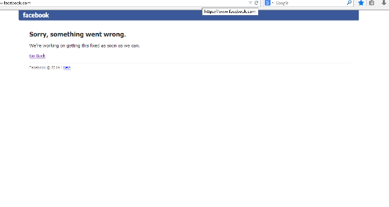 Tối ngày 1/8, khá nhiều người dùng Facebook tại Việt Nam không thể truy nhập được vào trang mạng xã hội này. Sự việc bắt đầu từ khoảng 23h tối ngày 1/8. Khi truy cập vào Facebook theo địa chỉ www.Facebook.com, thay vì bảng cập nhật trạng thái New Feed như thường thấy, các thành viên của mạng xã hội này chỉ nhìn thấy dòng chữ "Sorry Something went wrong. We're working on getting this fixed as soon as we can" tạm dịch là "Xin lỗi vì một chút gián đoạn, chúng tôi đang làm việc để khắc phục lỗi này trong thời gian nhanh nhất có thể".