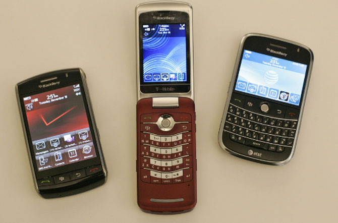 Từ trái qua phải, là những máy BlackBerry Storm, BlackBerry Pearl Flip 8220 và BlackBery Bold 9000, tất cả đều ra mắt năm 2008 khi iPhone đã bắt đầu chiếm được sự thống lĩnh thị trường.