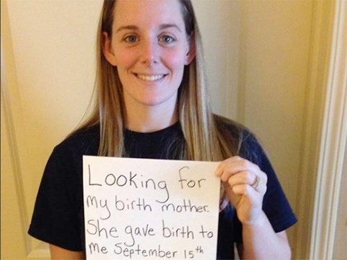 Katheryn bèn chụp hình mình đang cầm một tờ giấy với lời nhắn: "Tôi đang tìm mẹ đẻ của mình... Bà ấy bỏ tôi lại cửa hàng Burger King khi mới chỉ sinh tôi được vài giờ tại Allentown PA. Làm ơn chia sẻ tấm hình này để giúp tôi tìm bà". Tấm hình nhanh chóng được nhiều người chia sẻ, thậm chí báo giới cũng viết về câu chuyện của cô.