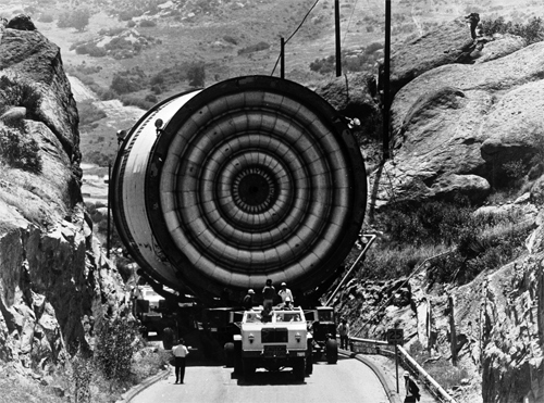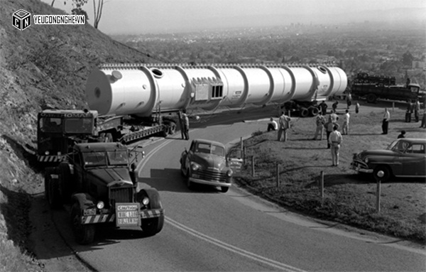 Cảnh chuyên chở máy gia tốc các hạt nặng thẳng Post-Stripper HILAC tại một khúc cua trên đường Cyclotron, California, Mỹ vào tháng 4/1956. |