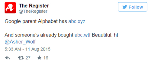 Ngày 10/8, công ty chuyên về dịch vụ tìm kiếm trực tuyến Google thông báo thành lập công ty mẹ có tên Alphabet để tách riêng mảng sản phẩm Internet cốt lõi với các mảng mới. Alphabet sẽ có địa chỉ web là abc.xyz, khiến tên miền này lập tức thu hút sự chú ý. Tuy nhiên, lĩnh vực tên miền còn nhiều điều thú vị khác nữa.