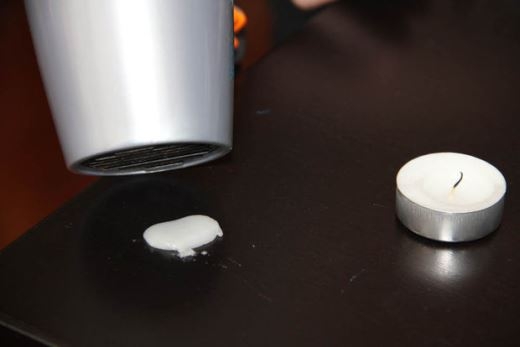 Thêm một thứ gây khó chịu trong nhà nữa: sáp đèn cầy rơi vãi. Cách tốt nhất để lau chùi nó chính là dùng máy sấy sấy vào để sáp mềm ra rồi lấy giấy lau sạch.