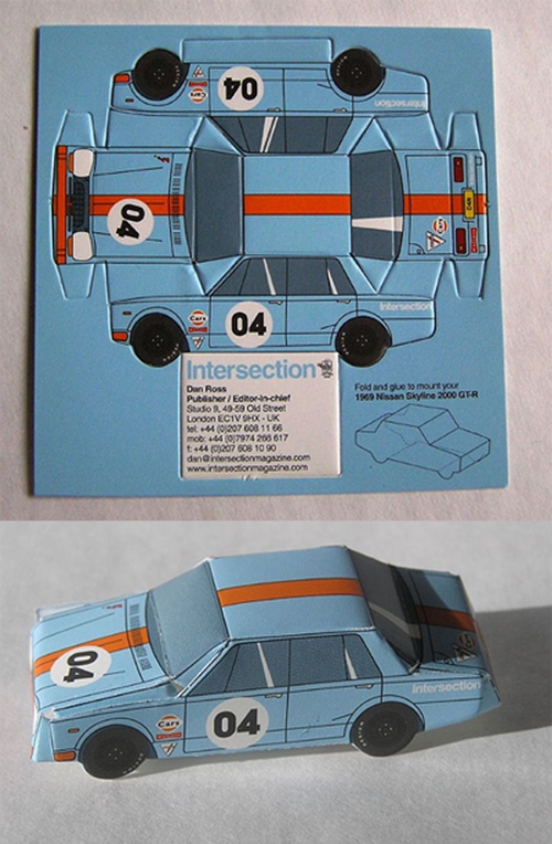 Tạp chí ôtô này dùng loại danh thiếp có thể gập lại thành hình chiếc Nissan Skyline 1969.