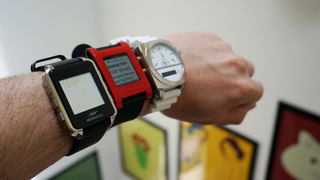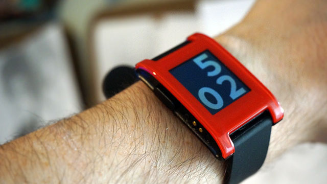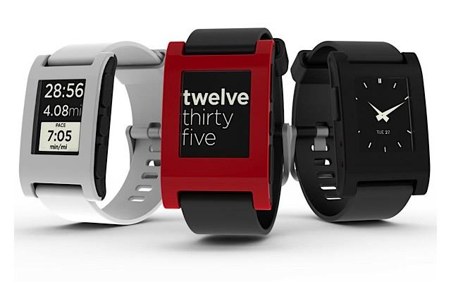 Smartwatch Pebble (giá 150 USD) có thiết kế không quá cầu kỳ nhưng lại sở hữu loại màn hình giấy E-Ink dễ đọc với đèn nền có thể kích hoạt bằng cách lắc nhẹ cổ tay. Hiện tại thì Pebble mới chỉ có 10 giao diện mặt đồng hồ trong gói phần mềm đi kèm máy. Pebble là sản phẩm sở hữu màn hình e-ink 1,26 inch với độ phân giải 144 x 168 pixel và chỉ hiển thị được hai màu trắng đen. Model này hỗ trợ Bluetooth 4.0, được tích hợp cảm biến rung, gia tốc kế và la bàn. Pebble hứa hẹn sẽ sở hữu nhiều giao diện đồng hồ, hệ thống âm báo, cũng như nhiều phần mềm tiện ích khác trong tương lai gần.