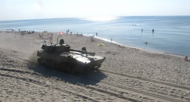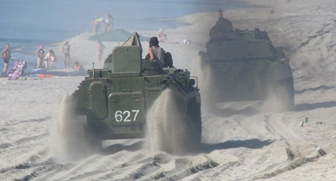 | Đoàn xe thiết giáp quân đội Nga cắt qua bãi tắm dưới ánh mắt tò mò và ngạc nhiên của các du khách. |