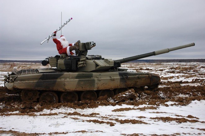 | Thay vì cưỡi Tuần lộc, ông già Noel này cưỡi xe tăng chiến đấu chủ lực T-72 đi phát quà. |