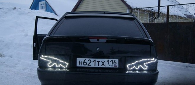 Đèn hậu của một chiếc xe hơi với hình ảnh súng trường tiến công AK-47 quen thuộc.
